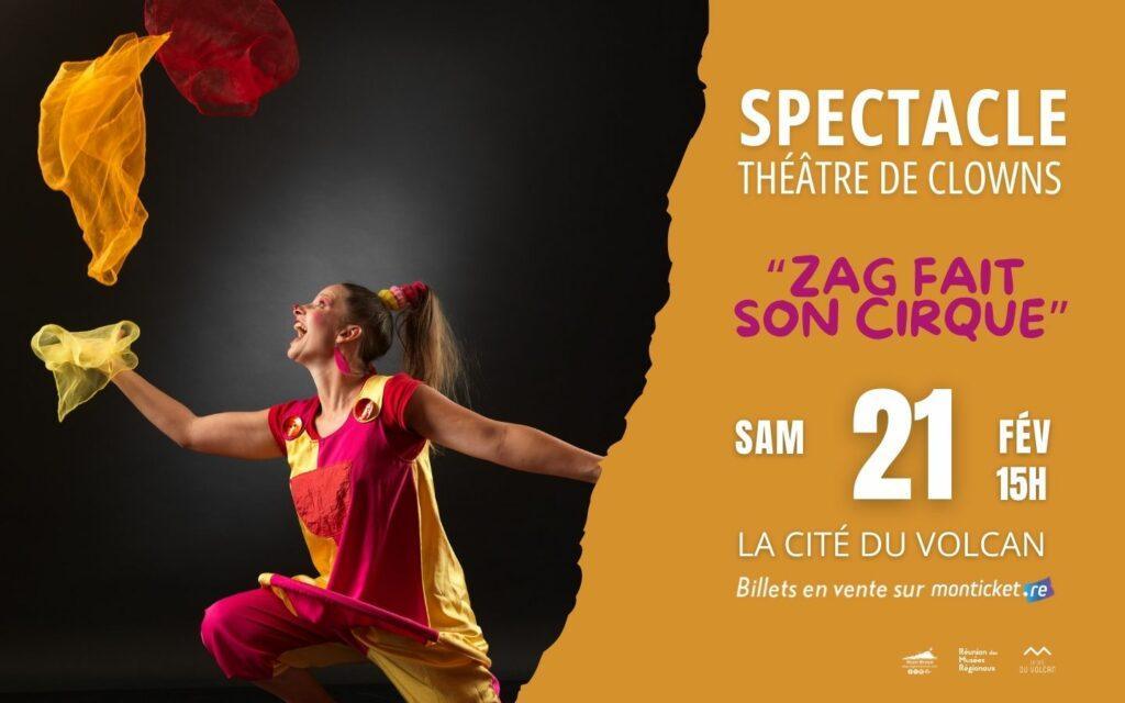 Découvrez le spectacle « ZAG FAIT SON CIRQUE » un théâtre de clowns de la Cie Zag Zag Zag, le Samedi 21 février 2026 à 15h00 à la Cité du Volcan. Sourire…