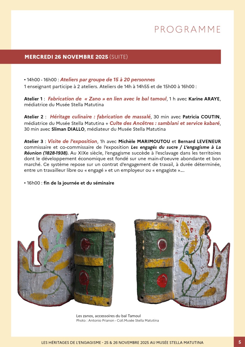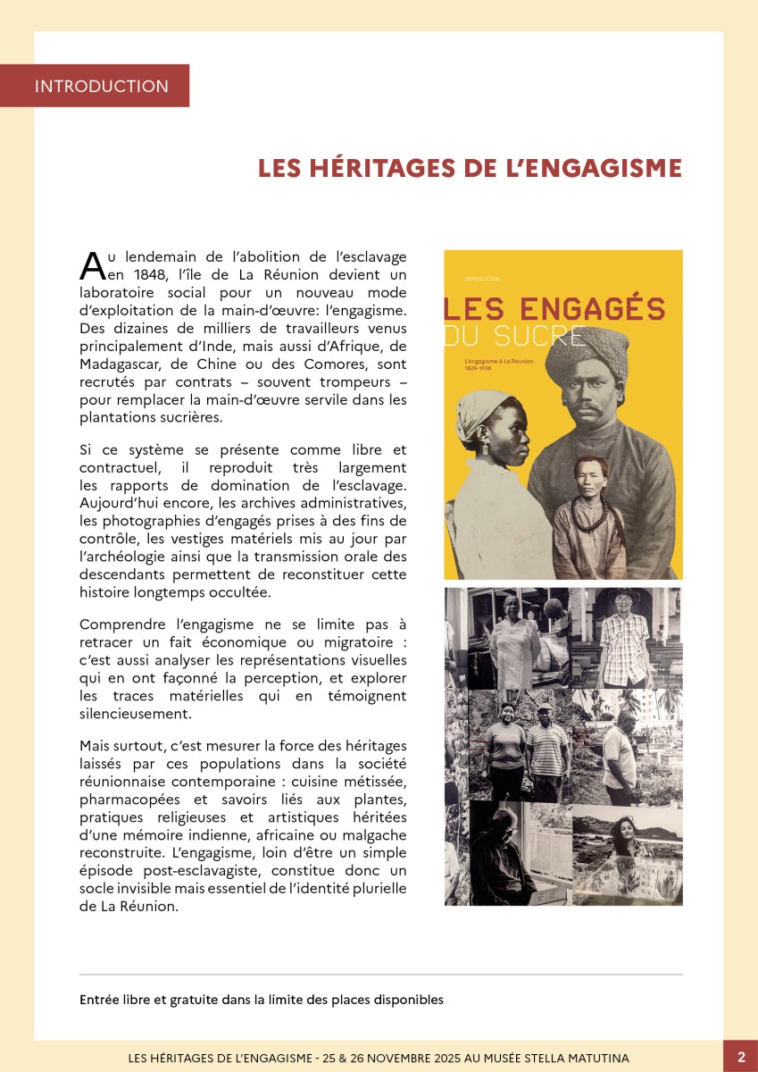 Atelier 3 : Visite de l’exposition, 1h avec Michèle MARIMOUTOU et Bernard LEVENEUR commissaire et co-commissaire de l’exposition Les engagés du sucre / L’engagisme à La Réunion (1828-1938). Au XIXe siècle, l’engagisme succède à l’esclavage dans les territoires dont le développement économique est fondé sur une main-d’oeuvre abondante et bon marché. Ce système repose sur un contrat d’engagement de travail, à durée déterminée, entre un travailleur libre ou « engagé » et un employeur ou « engagiste »….