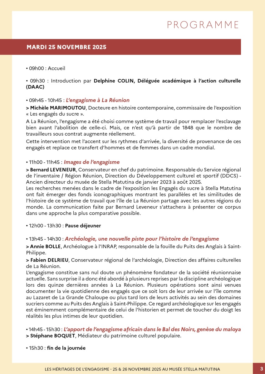 • 11h00 – 11h45 : Images de l’engagisme > Bernard LEVENEUR, Conservateur en chef du patrimoine. Responsable du Service régional de l’inventaire / Région Réunion, Direction du Développement culturel et sportif (DDCS) – Ancien directeur du musée de Stella Matutina de janvier 2023 à août 2025. Les recherches menées dans le cadre de l’exposition les Engagés du sucre à Stella Matutina ont fait émerger des fonds iconographiques montrant les parallèles et les similitudes de l’histoire de ce système de travail que l’île de La Réunion partage avec les autres régions du monde. La communication faite par Bernard Leveneur s’attachera à présenter ce corpus dans une approche la plus comparative possible.