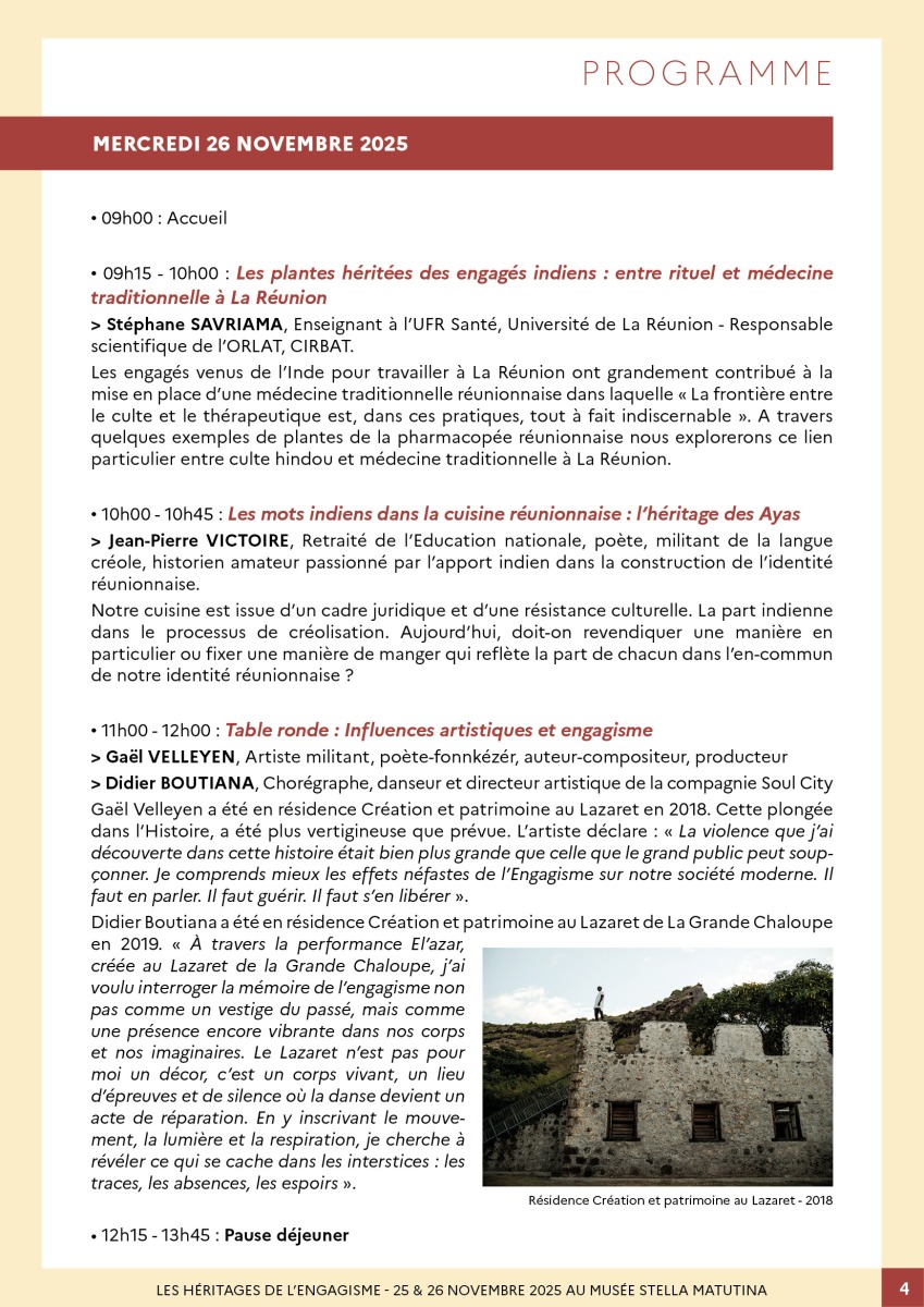 • 11h00 – 12h00 : Table ronde : Influences artistiques et engagisme > Gaël VELLEYEN, Artiste militant, poète-fonnkézér, auteur-compositeur, producteur. > Didier BOUTIANA, Chorégraphe, danseur et directeur artistique de la compagnie Soul City. Gaël Velleyen a été en résidence Création et patrimoine au Lazaret en 2018. Cette plongée dans l’Histoire, a été plus vertigineuse que prévue. L’artiste déclare : « La violence que j’ai découverte dans cette histoire était bien plus grande que celle que le grand public peut soupçonner. Je comprends mieux les effets néfastes de l’Engagisme sur notre société moderne. Il faut en parler. Il faut guérir. Il faut s’en libérer ». Didier Boutiana a été en résidence Création et patrimoine au Lazaret de La Grande Chaloupe en 2019. « À travers la performance El’azar, créée au Lazaret de la Grande Chaloupe, j’ai voulu interroger la mémoire de l’engagisme non pas comme un vestige du passé, mais comme une présence encore vibrante dans nos corps et nos imaginaires. Le Lazaret n’est pas pour moi un décor, c’est un corps vivant, un lieu d’épreuves et de silence où la danse devient un acte de réparation. En y inscrivant le mouvement, la lumière et la respiration, je cherche à révéler ce qui se cache dans les interstices : les traces, les absences, les espoirs ».